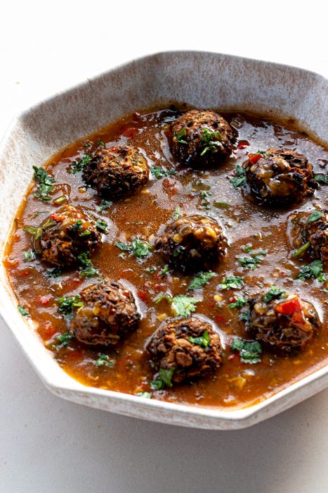 This version stays true to the spirit of the dish: crisp vegetable balls (‘manchurian’) tossed in a glossy, punchy hot garlic sauce that’s equal parts spicy, tangy, and addictive. I add tempeh to the vegetable mixture here, confident that any bitterness melts away once it meets that bold sauce. Serve it the classic way with fried rice or noodles, or spoon it over plain white rice or quinoa for a satisfying weeknight meal.