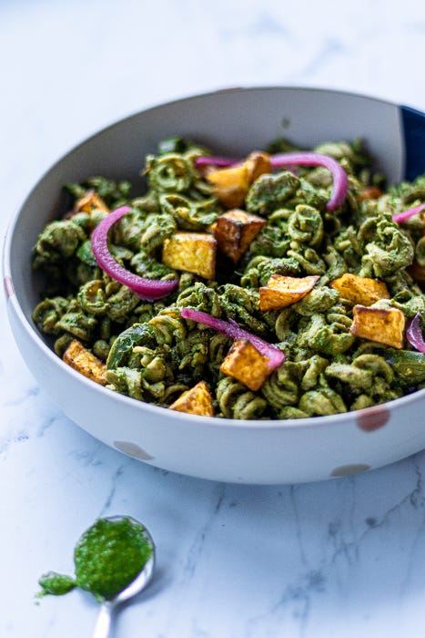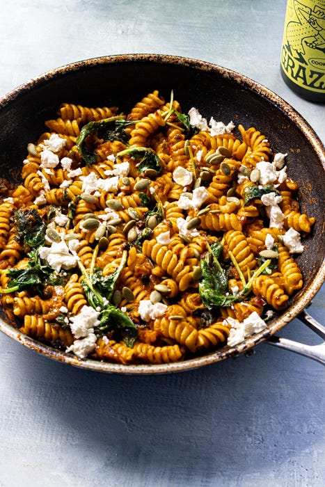 I often serve this with a high-protein, low-carb pasta like Kaizen (made of lupini beans) so I can make room for one of my favorite pairings: a few golden roasted potatoes tossed right in. Some fresh or frozen corn would also go really well here. Feel free to use whatever pasta works for you. A scatter of nuts, and a spoonful of pickled onions add welcome texture and brightness to the bowl.