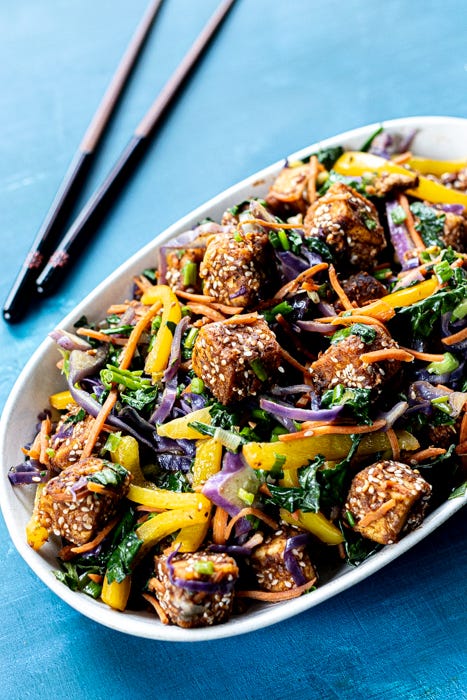 Peanut Chile Tofu Stir Fry - Peanut butter and Tofu = BFFs. A lightly sweet and spicy sauce with lots of umami coats tofu that’s been cooked to perfection with a crispy exterior and soft interior (no pressing involved). Add on a rainbow of vegetables and you’ve got yourself an standout meal with 30g protein per serving. I may be willing to look the other way if you want to serve this with a little white rice.
