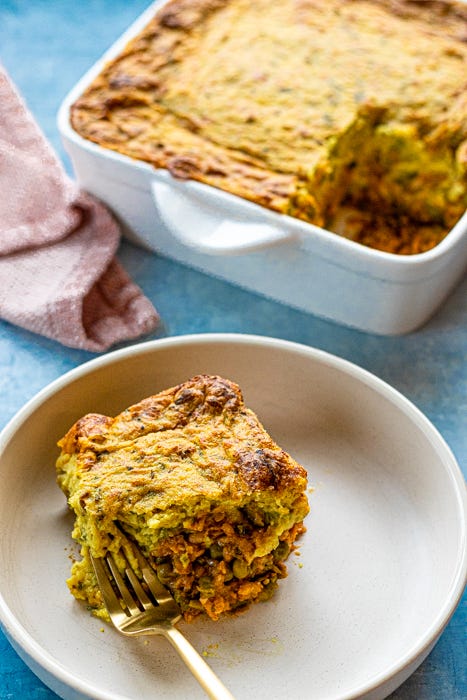 Samosa Tempeh Shepherds Pie - This is the showstopper — the one that earns a spot in the middle of the table and makes even the carnivores pause and say, “Wait… what is that?” Tempeh, my new favorite ingredient, forms the hearty, flavorful, protein-rich base of this shepherd’s pie.